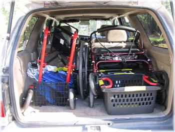 I can already tell that I'm going to want to take my Walk'N'Chair lots of places. It's pretty easy to remove the wheels. And the wheels and body individually are fairly light. So it's pretty easy to carry the disassembled unit in a variety of vehicles. As seen here in the picture of our 4-runner, there's a regular rolling walker on the right and the disassembled Walk'n'Chair seen on the left.